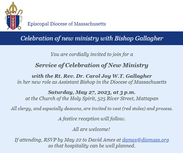 Diocesan community invited to May 27 new ministry celebration with Bishop Gallagher: A service in celebration of new ministry with the Rt. Rev. Dr. Carol J.W.T. Gallagher in her role as assistant bishop in the Diocese of Massachusetts takes place on Saturday, May 27 at 3 p.m. at the Church of the Holy Spirit in Mattapan. All are invited to join the celebration! If attending, RSVP by May 22 to David Ames at dames@diomass.org so that hospitality can be well planned.