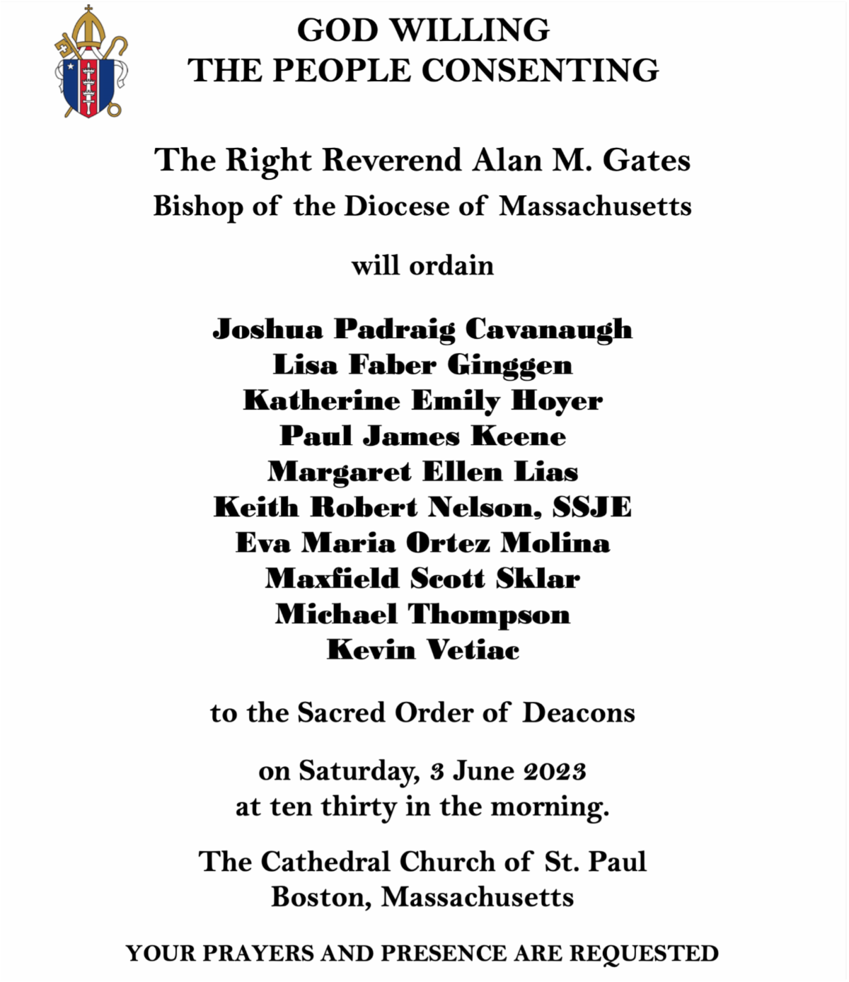 Jun 3: Diaconal Ordinations, Cathedral Church of St. Paul, Boston, 10:30am
