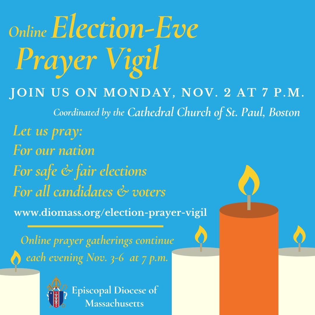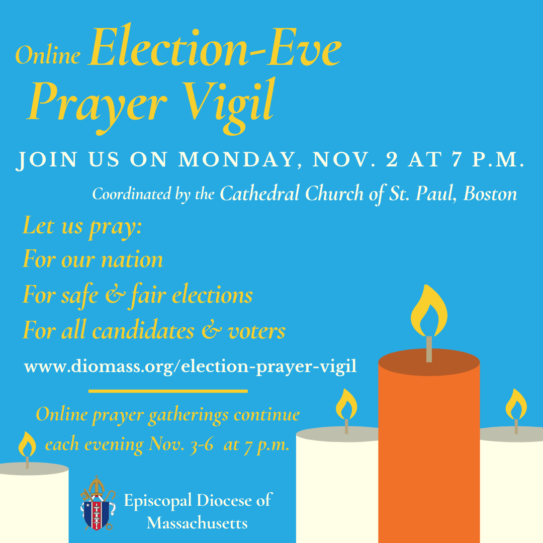 All are invited to join the Cathedral Church of St. Paul and a group of partner congregations who are coordinating an online prayer vigil for the diocesan community on Monday, Nov. 2, at 7 p.m., to pray for our nation, for safe and fair elections, and for all candidates and voters. Bishop Alan M. Gates will offer the welcome and blessing.