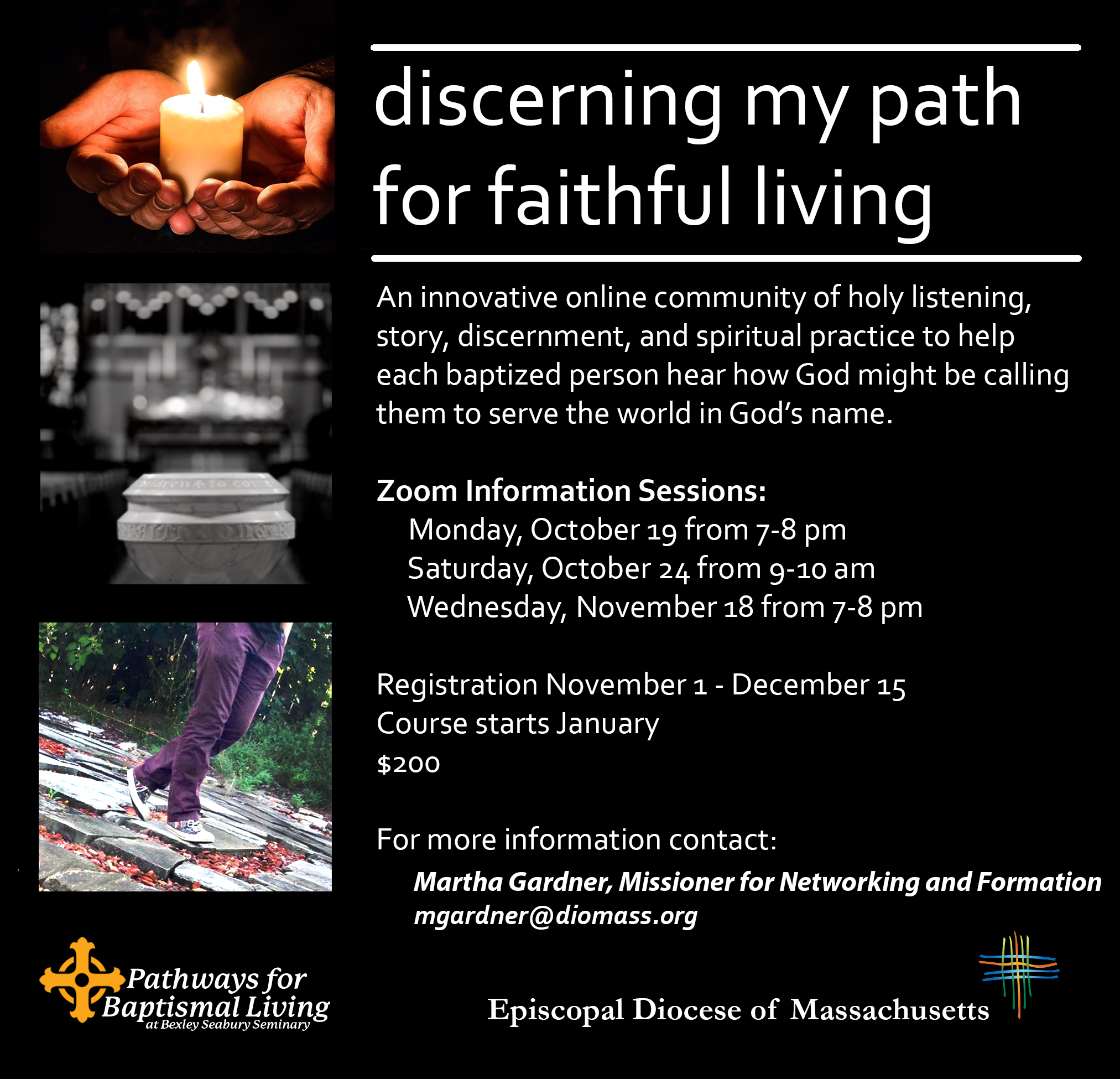 The Diocese of Massachusetts joins other New England dioceses in Province I in partnering with Bexley-Seabury Seminary to offer this six-month lay discernment program. In addition to monthly online meetings in small groups, participants will engage with spiritual reading, videos and articles on discernment, spiritual practices and the ministry of the baptized.