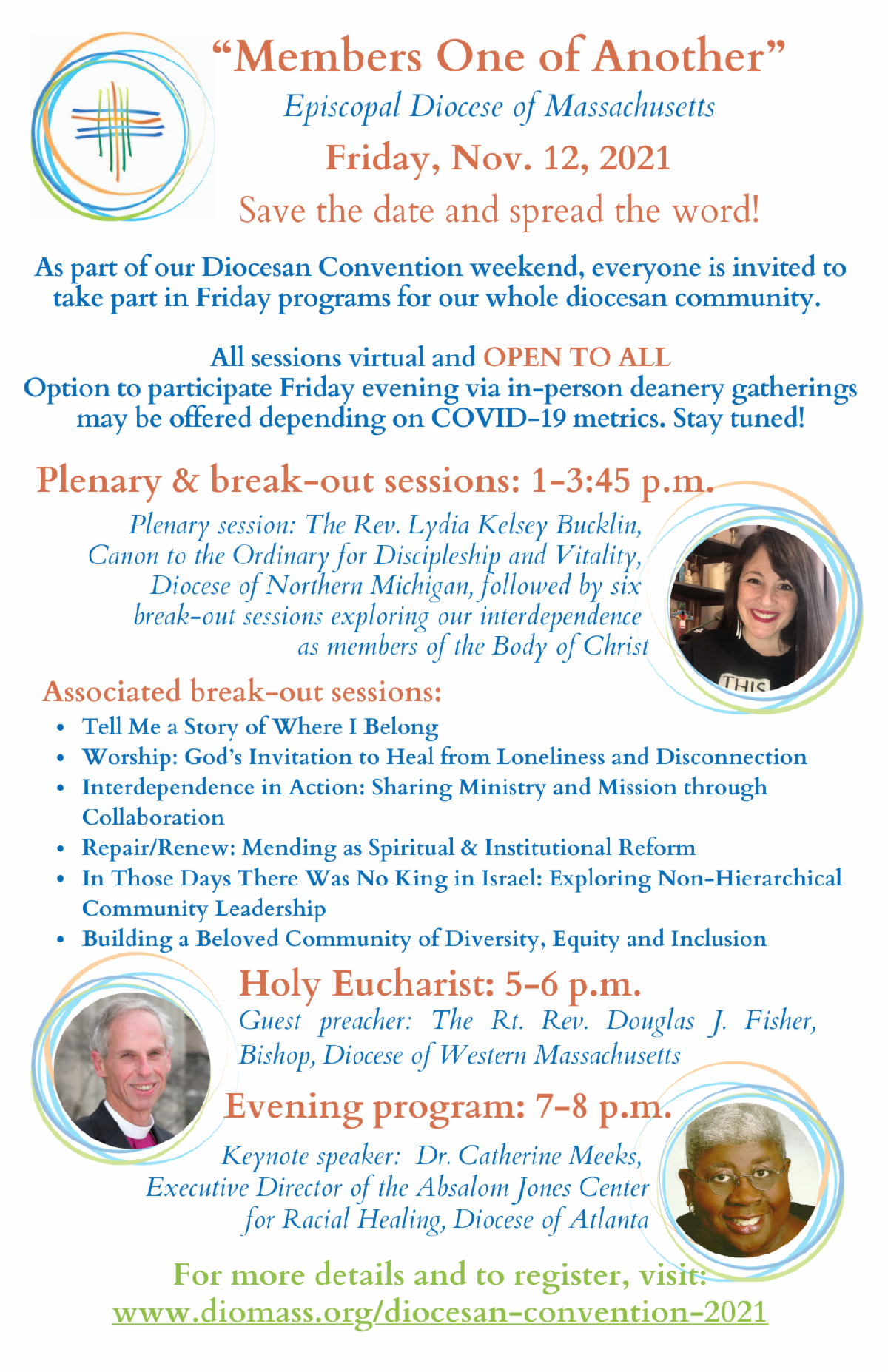 Bishop Douglas J. Fisher from the neighboring Diocese of Western Massachusetts will be the guest preacher at the 5 p.m. service of Holy Eucharist, followed at 7 p.m. by a keynote address from Dr. Catherine Meeks, Executive Director of the Absalom Jones Center for Racial Healing in the Diocese of Atlanta. Her topic is “Dancing on Paradox’s Floor While Searching for Beloved Community.”