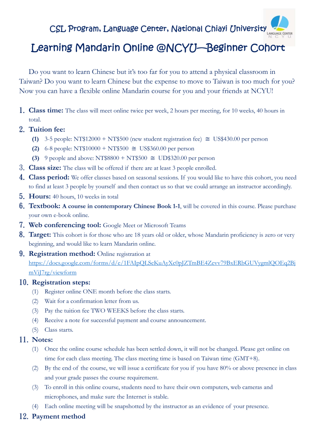 Thursdays, 18:00 - 20:00 pm: Mandarin Language Table, Harvard Language Center, 1 Oxford St, Cambridge, Room B06. All proficiency levels welcome. Information: tsim@mba2023.hbs.edu