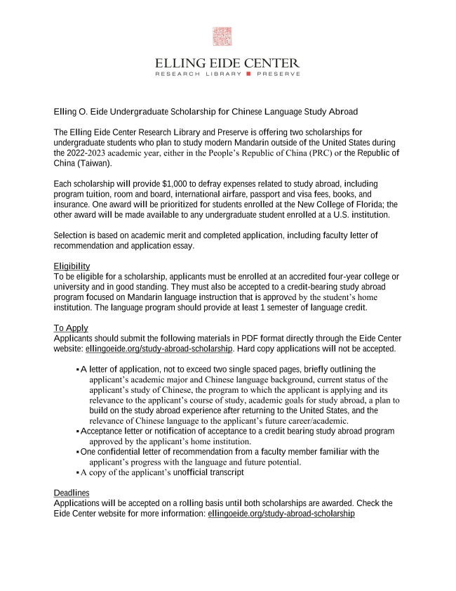Elling Eide Center Research Library and Preserve in Sarasota, FL offers two scholarships for undergraduate students to study modern Mandarin abroad during the 2022-2023 academic year (including summer), in either the People's Republic of China or Taiwan! Click the image to the left to see their announcement. Apply here!