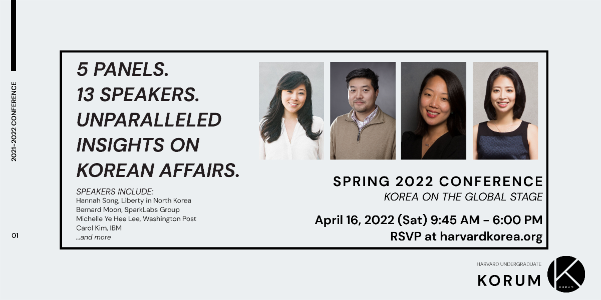 Harvard Undergraduate KORUM is a student-led organization dedicated to facilitating conversations on Korean affairs. The conference will host featured speakers across a wide range of panels - ranging from tech (Executive Director at IBM), geopolitics and international relations (current Chargé d'Affaires of the U.S. Embassy in Korea), advocacy (CEO & President of Liberty in North Korea), culture/media (author of NYT Bestseller Frankly in Love), and business (Co-founder and Partner at SparkLabs Group).
