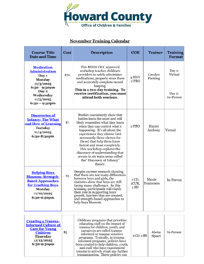 This MSDE OCC approved workshop teaches childcare providers to safely administer medications, properly store them and accurately complete record keeping. This is a two-day training. To receive certification, you must attend both sessions.