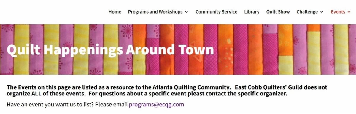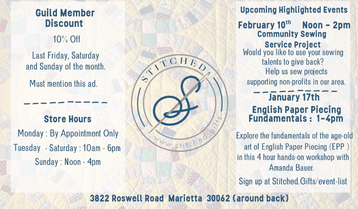 We have an action-packed January, with lots of opportunities to spend time with your quilting besties! First, our Matriotism exhibit opens at the Atlanta History Center in Buckhead. Next, we celebrate Community Service volunteerism at both our evening and day meetings. After that, we launch a new Lunchbox Live event focusing on the power of documenting your quilts. Read this month’s newsletter to get all the details, and see the full calendar of 2026 Guild events at this link: ECQG Calendar of Guild Events.