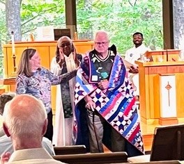 In this photo, ECQG's Adele Swanson presents one of the four quilts to a veteran of the Vietnam War.