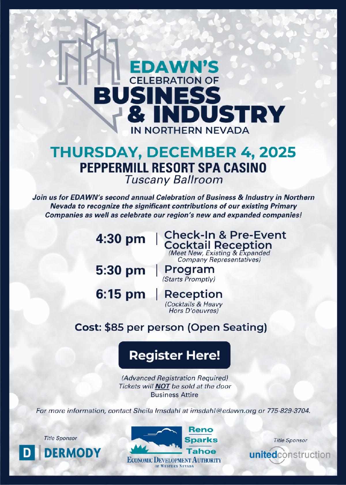 | | BUSINESS RETENTION & EXPANSION UPDATES | | Primary Company Future Form Manufacturing, formerly B&J Industries, is expanding its U.S. operations and tripling production capacity to meet growing demand for its data center infrastructure products. The company’s new 150,000-square-foot facility in Sparks, Nevada, strengthens its national footprint and supports continued growth in advanced manufacturing. EDAWN congratulates Future Form on this exciting expansion and is proud to see another primary company driving innovation, investment, and high-quality job creation in Northern Nevada. Learn more about their expansion here. | | |