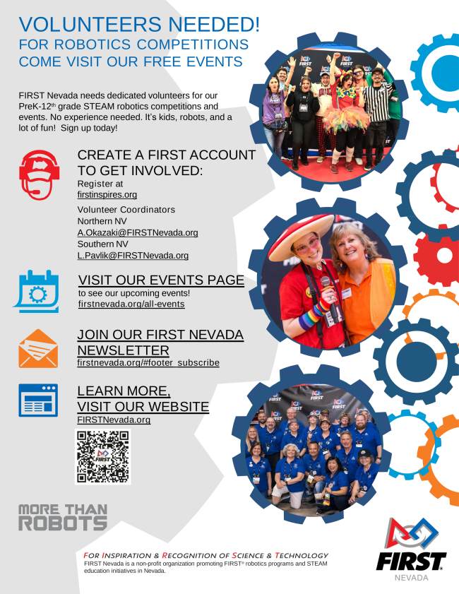 First Nevada needs dedicated volunteers to help PreK-12 grade STEAM robotics competitions and events. Learn more about First Nevada’s programs to introduce students to engineering and coding here info.firstinspires.org/first-divehow.