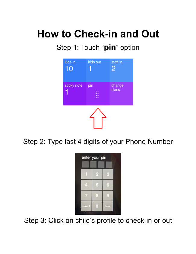 Due to childcare regulations, all children in the center must be signed in and out by a parent or guardian. The sign in and out process is completed on a classroom iPad by a parent or guardian typing in his or her unique 4-digit PIN code in the Tadpoles application.