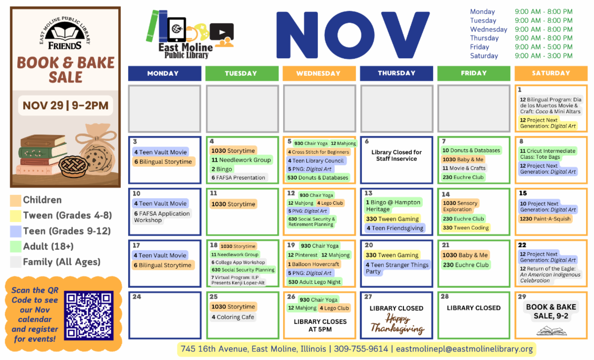 In November, we will again be having a Book & Bake Sale on Small Business Saturday, November 29. If anyone would like to bake for this, please email Tami for more info at tdcox715@yahoo.com. There is also a donation box for holiday wrapping paper in the lobby at the library - this will be used for the book sale. Donations can dropped off through the end of November.
