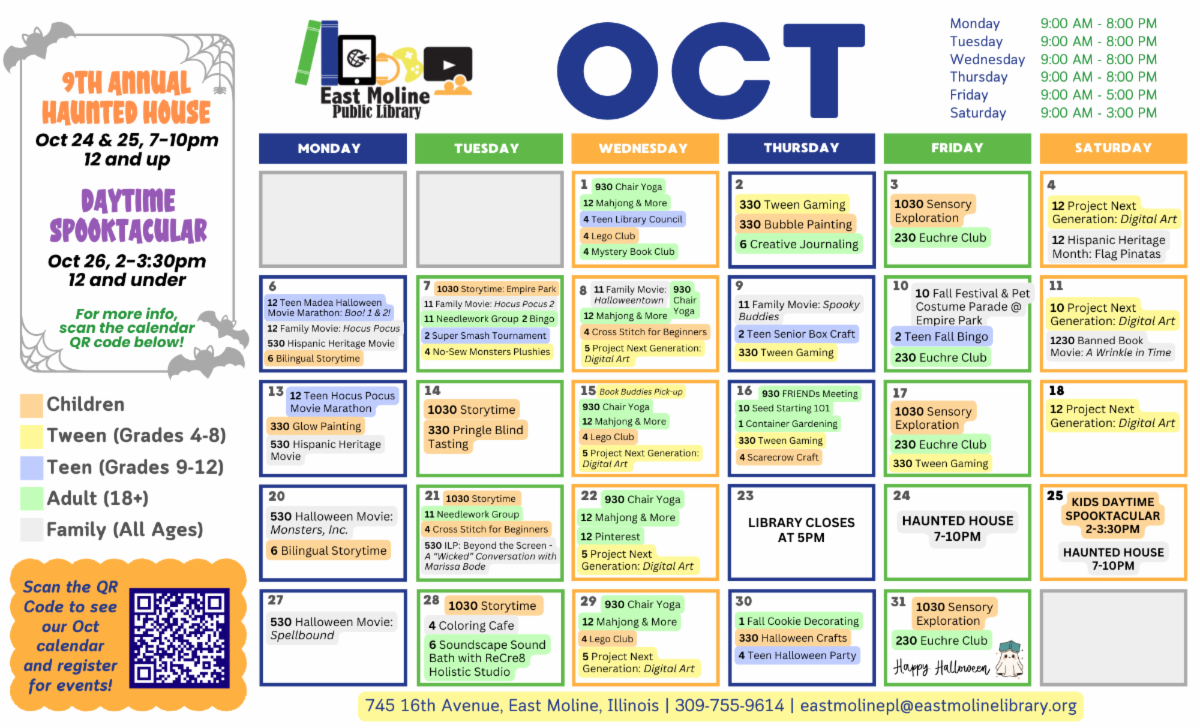 Get ready to experience the library like never before as it transforms into a spooky haunted house that promises thrills and chills for all! But if you're looking for a fright-free adventure, visit our Daytime Spooktacular, specially designed for kids 12 and under!