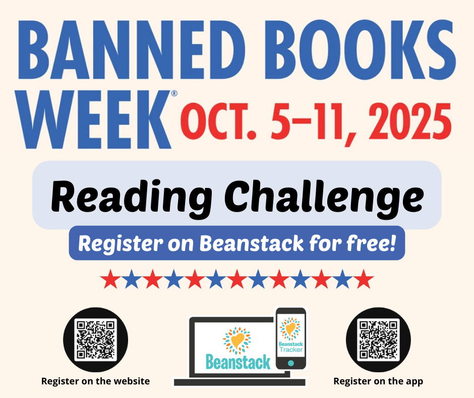 | | Celebrate Banned Books Week with us! | | All ages are welcome to participate! Earn tickets for grand prizes by logging one banned book and completing activities. The banned book you read does not have to be from the top 10 list - for a list of banned books, check out Goodreads, PEN America, and B&N. Register on the Beanstack website, or the Beanstack app. | |