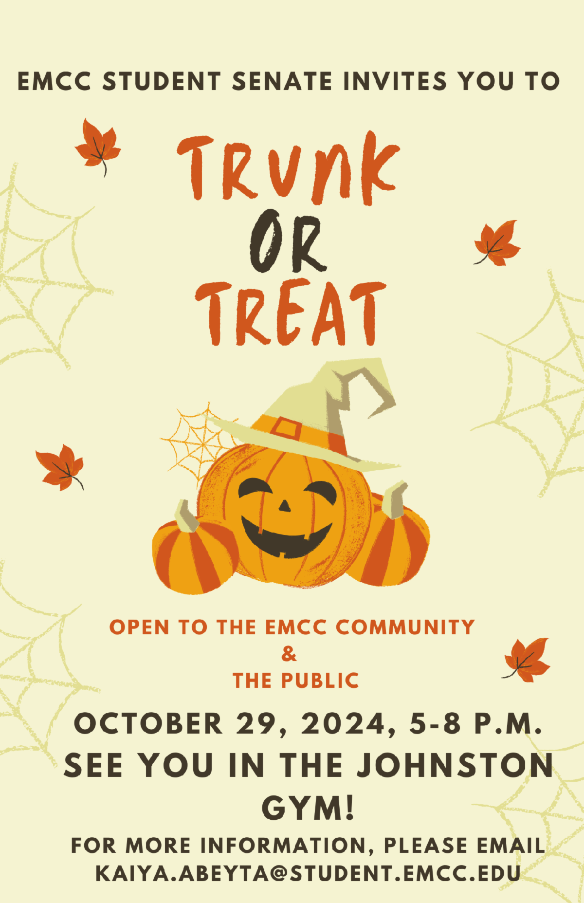 Tuesday, 10/29 - Trunk or Treat (5pm - 8pm) - Free candy, fun games, and entertaining activities. Bring your friends and family and learn the join of trick-or-treating once more. Come down to Johnston Gym to participate! Sponsored by the Student Senate.