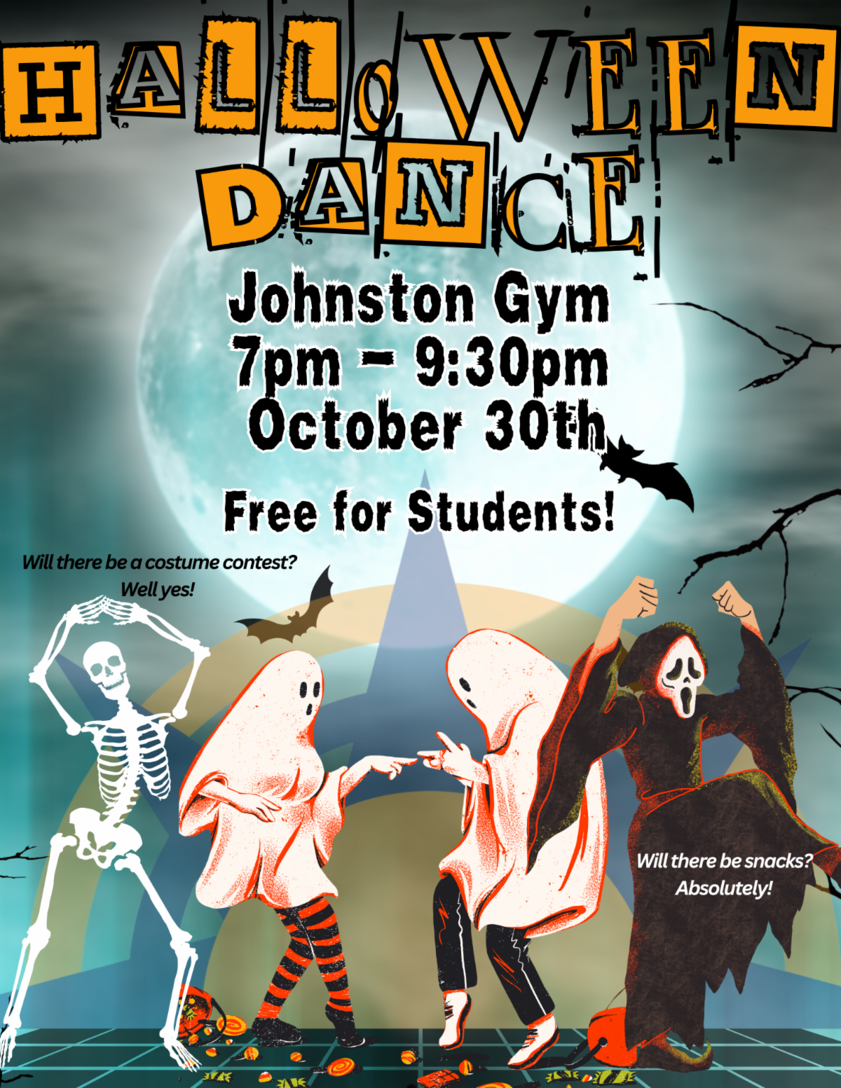 Wednesday, 10/30 - Halloween Dance (7pm - 9:30pm) - Time to do the monster mash and boogie away into the night. Enter the costume contest for screams of fun and fill your bones or bodies with snacks. Johnston Gym.