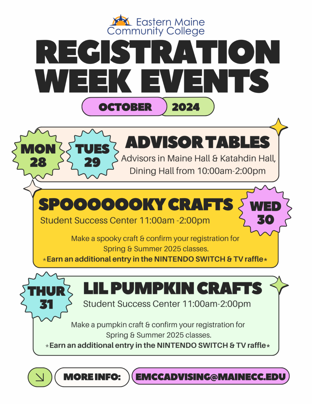 Monday through Thursday, 10-28 - 10/31 - Boo Bags Fundraiser (11am-3pm) - EMCC's Nursing students are selling Boo Bags to raise funds for their Pinning Ceremony! You can pick up your own Boo Bag filled with tricks and treats in the Maine Hall lobby