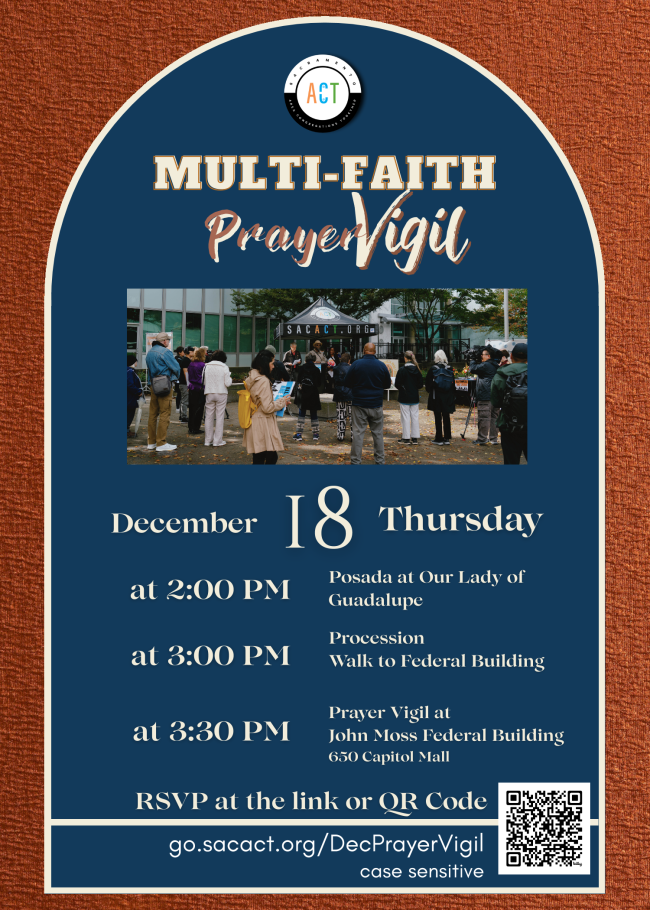 SacACT will be hosting a multi-faith prayer vigil which begins at Our Lady of Guadalupe. Guests are invited to bring photos of loved ones or those impacted by ongoing crises for a communal altar.