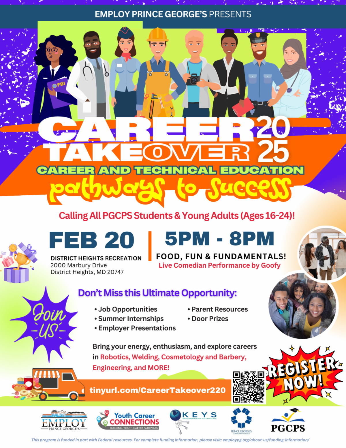 An exciting day to explore career and technical education opportunities - open to all PGCPS students and young adults (ages 16-24)!