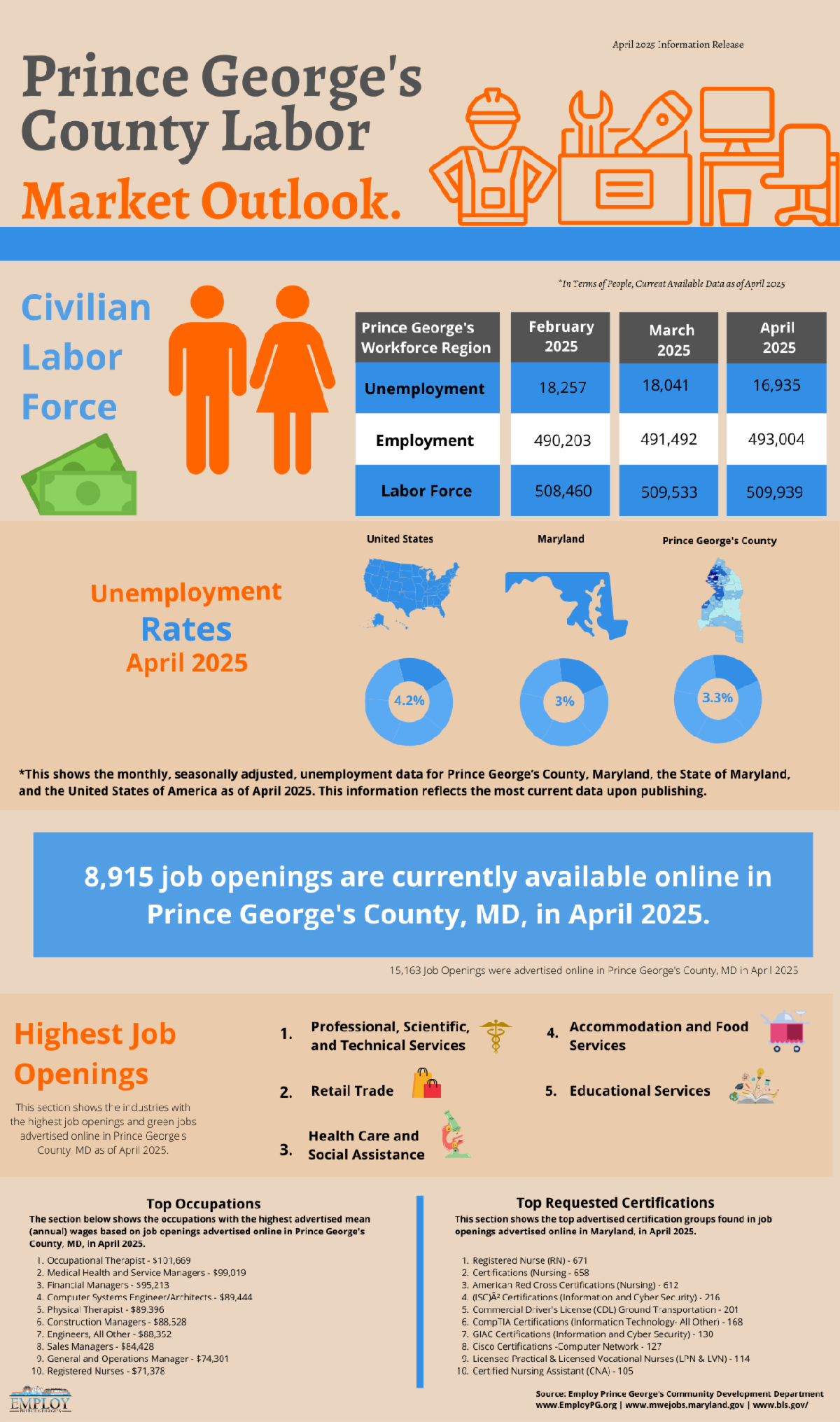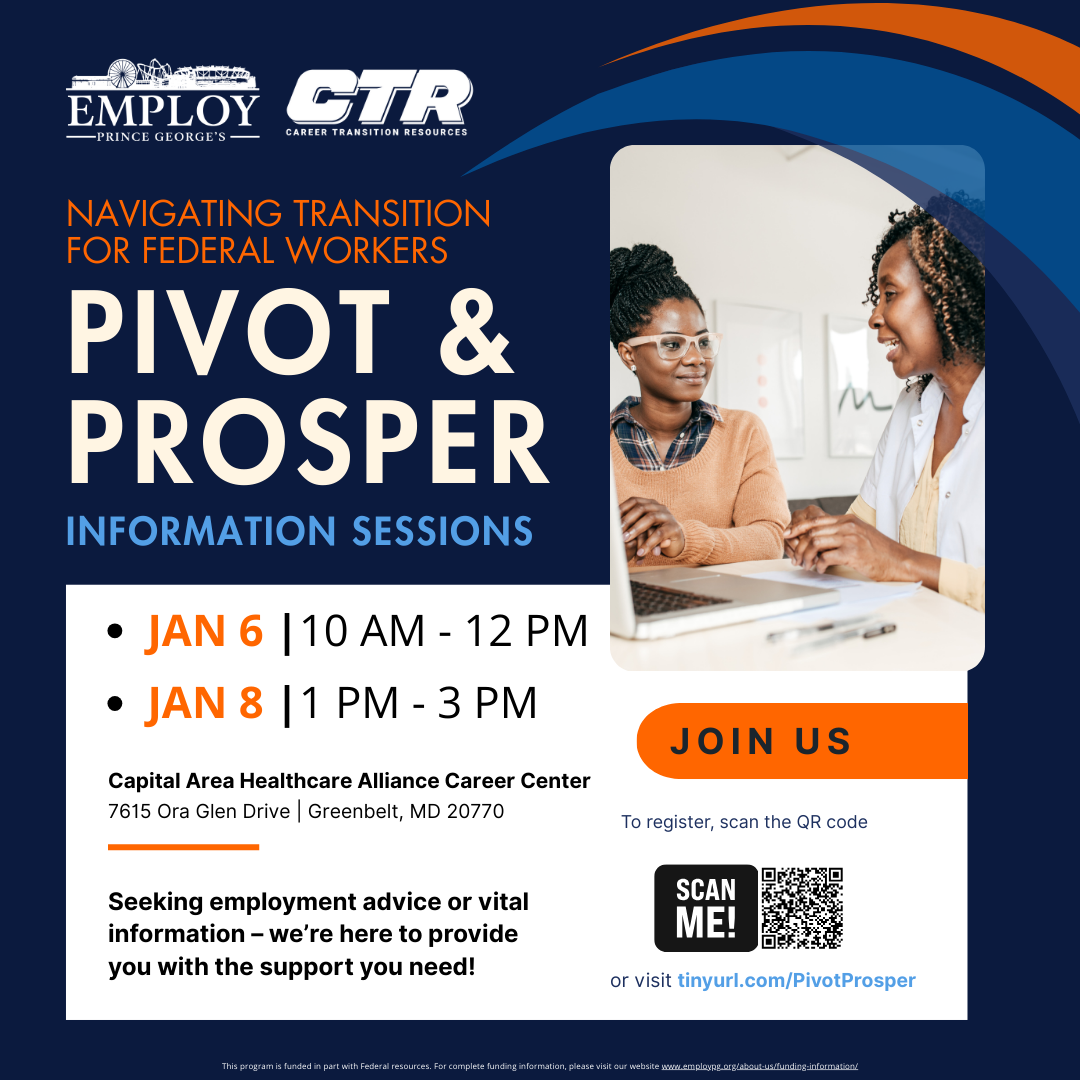 Prince George's County Labor Market Data | Monthly, Employ Prince George's provides workforce data covering salary, wages, occupations, and employment in Prince George's County. | | | Impacted Federal Employee Resources | Discover a wealth of valuable resources curated to support federal workers during challenging times. Explore essential guidance, support, and specialized assistance tailored to help you navigate uncertainties effectively. Whether you're seeking employment advice or crucial information, this page is designed to provide you with the support you need. | |