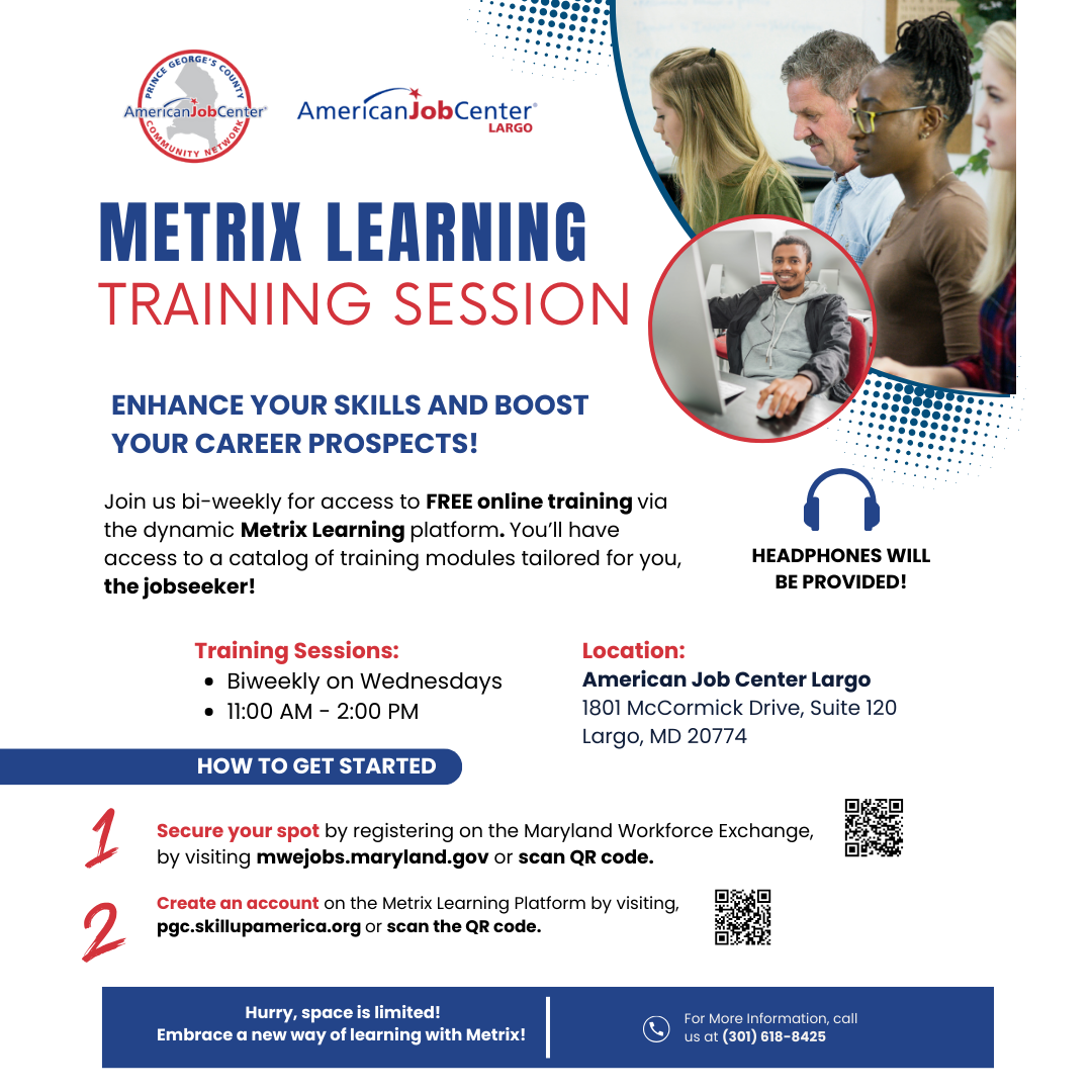 Join us at The American Job Center Largo for access to FREE online training via the dynamic Metrix Learning platform. You’ll have access to a catalog of training modules tailored for you!
