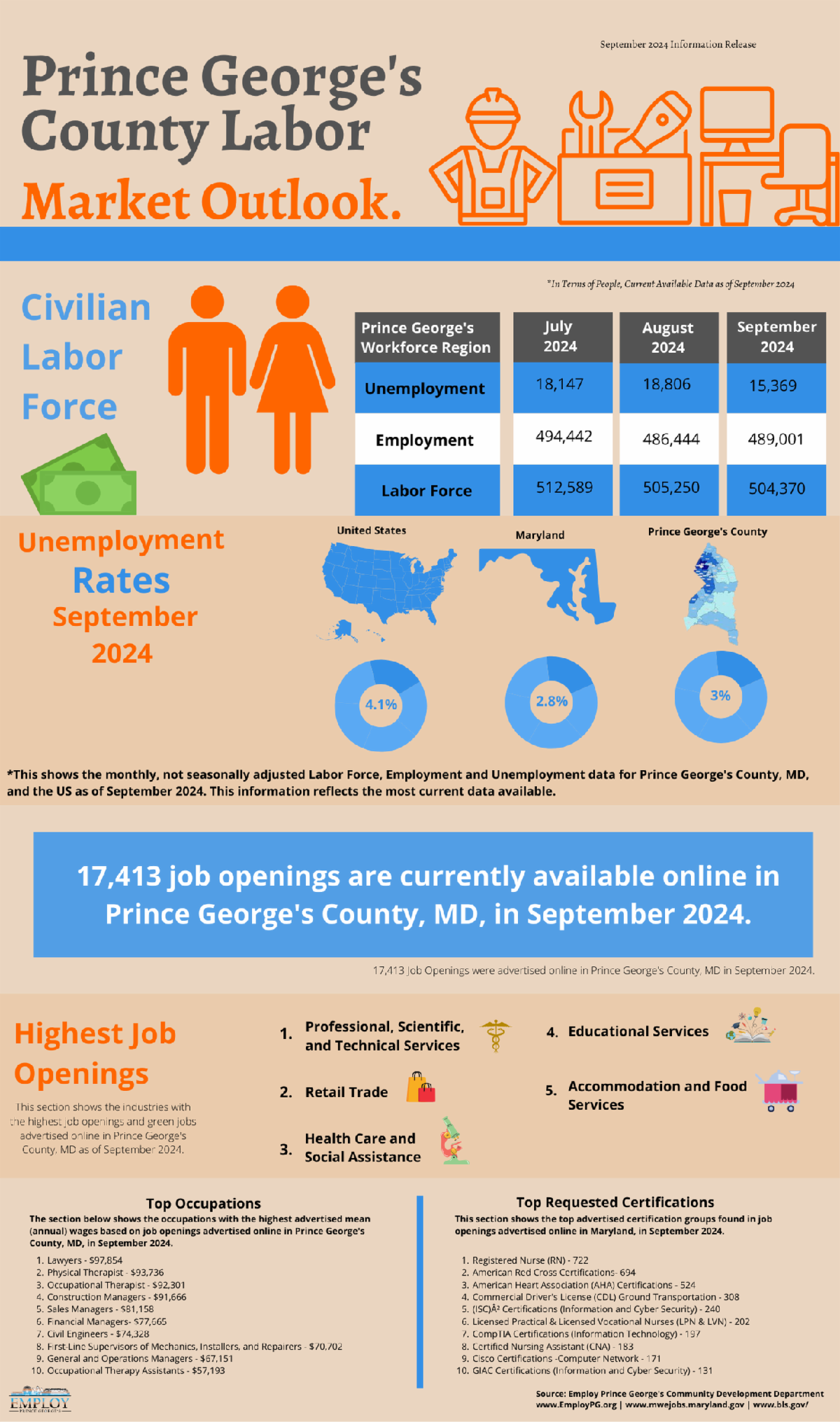 | Monthly, Employ Prince George's provides workforce data covering salary, wages, occupations, and employment in Prince George's County. | |