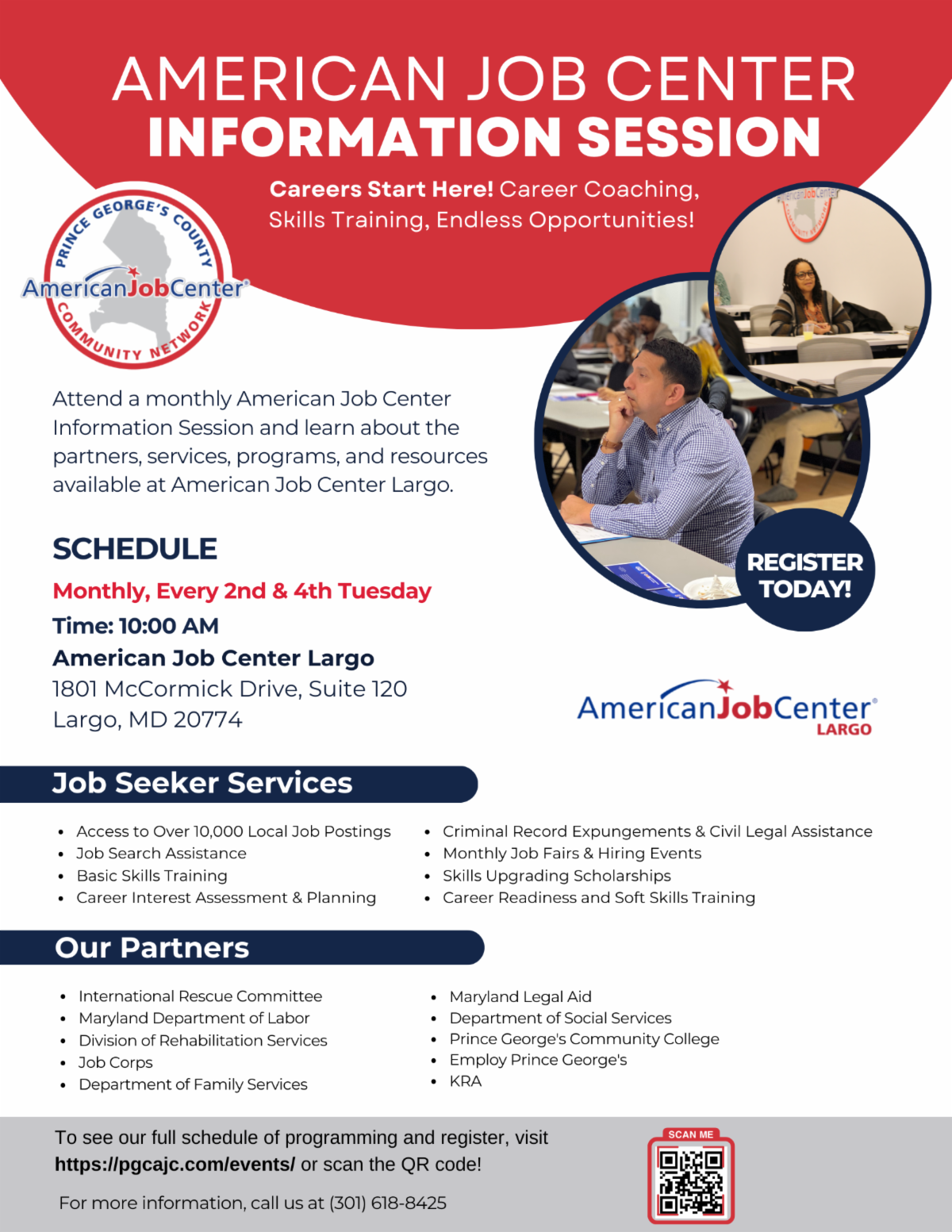 The Prince George's County Virtual Career Center (PGCVCC) offers workforce development services and career readiness training for Prince George's County residents. The PGCVCC also connects job seekers to job openings from local and regional businesses.