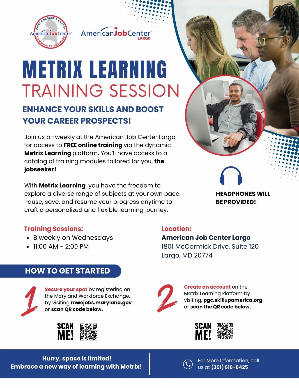 The American Job Center Largo is providing access to free online training through our Metrix Learning platform. Take advantage of the catalog of training modules tailored just for you!