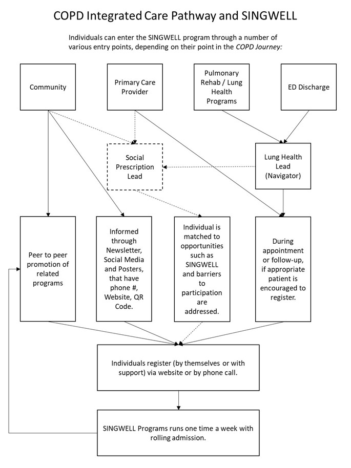 Collaborating with Primary Care team members at Chigamik and other organizations in the NSOHT helped determine a path for medical professionals to “prescribe” participation in the weekly singing group. Individuals can enter the SingWell program in various ways, depending on where they are on their journey with COPD, as shown in the pathway diagram at right (click it to enlarge). The program was designed to be accessible to people of all singing abilities - no prior singing experience or auditions required!