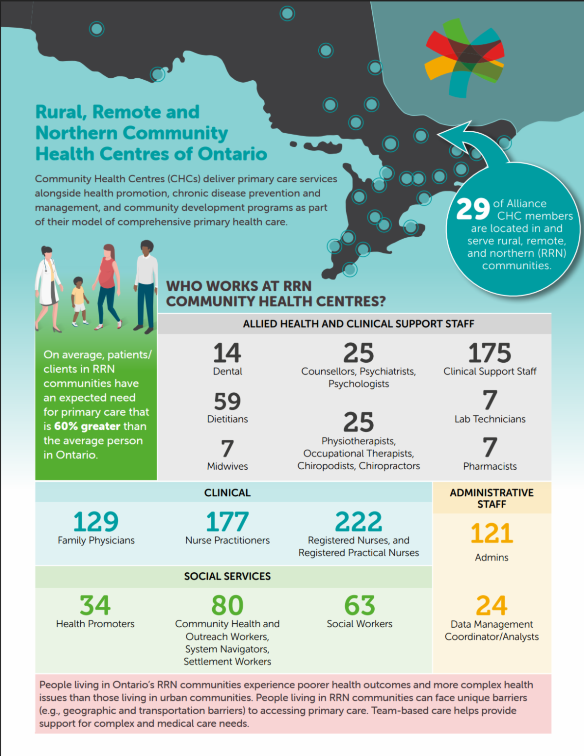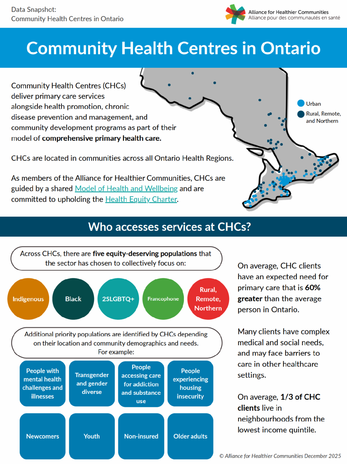 Thanks to our members, who took the time in the midst of all the busy-ness to respond to last year's membership survey, we are creating a series of infographics that describe our sector and illustrate our members' work of advancing health equity. So far, we have published and updated (and visually improved) CHC Data Snapshot (below, left) and a brand-new infographic on Rural, Remote and Northern Community Health Centres of Ontario (below, right). Coming soon: Infographics about how our sector is advancing equity for Black, Francophone, and 2SLGBTQ+ people and communities.