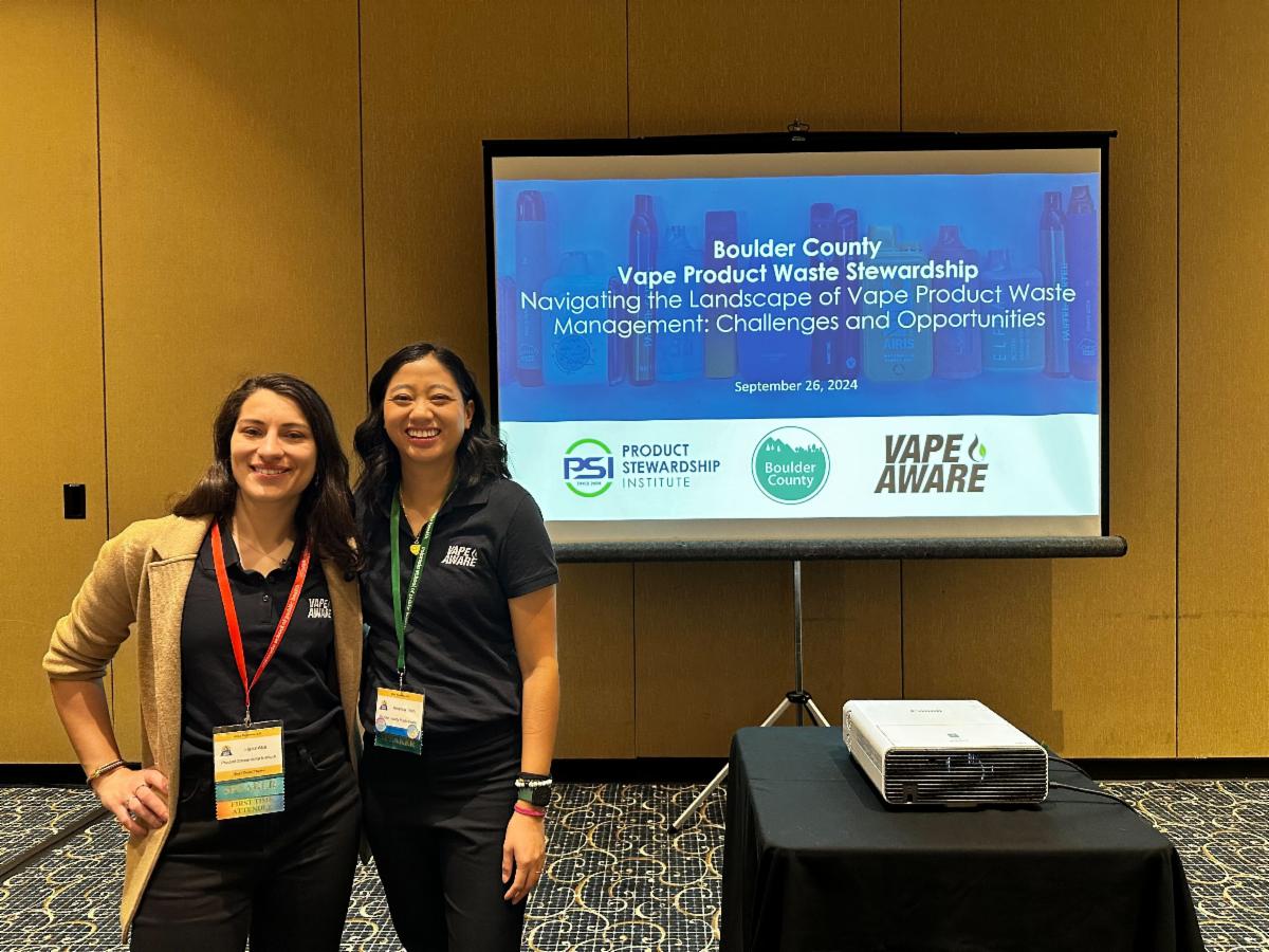 Boulder County and PSI recently presented on the Vape Aware program and policy research that we conducted together last year at the Public Health in the Rockies Conference and the NAHMMA Hazardous Materials Management Conference. The presentations were among the most attended sessions at their respective conferences, reflecting the high level of interest and growing need for effective solutions to VPW management. PSI and Boulder County are collaborating again this year to foster national discussion and action on VPW management. Contact us at info@productstewardship.us if you want more information or to get involved.