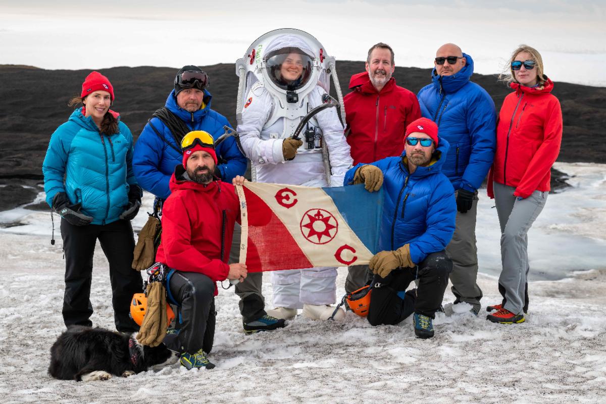 Expedition team members pose on the Vatnajokull glacial ice cap with Explorers Club flag #60, first taken on an expedition in 1935. They lived together in a small one room research hut for ten days testing the Mars suit. Photo credit: Dave Hodge Photography @davehodgephoto