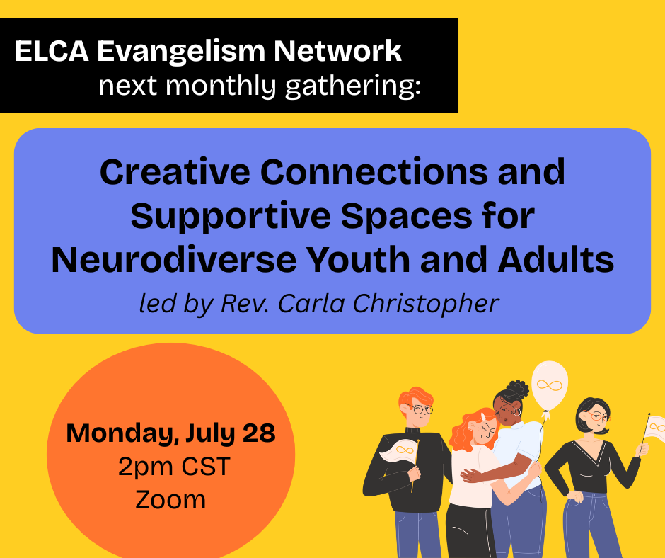 The Gospel is good news for everyone—but too often, our churches struggle to reflect the full diversity of God’s people, especially when it comes to neurodiverse youth and adults. That’s why the ELCA Evangelism Network invites you to our next monthly gathering: “Creative Connections and Supportive Spaces for Neurodiverse Youth and Adults,” led by Rev. Carla Christopher, on Monday, July 28 at 2 PM CST.