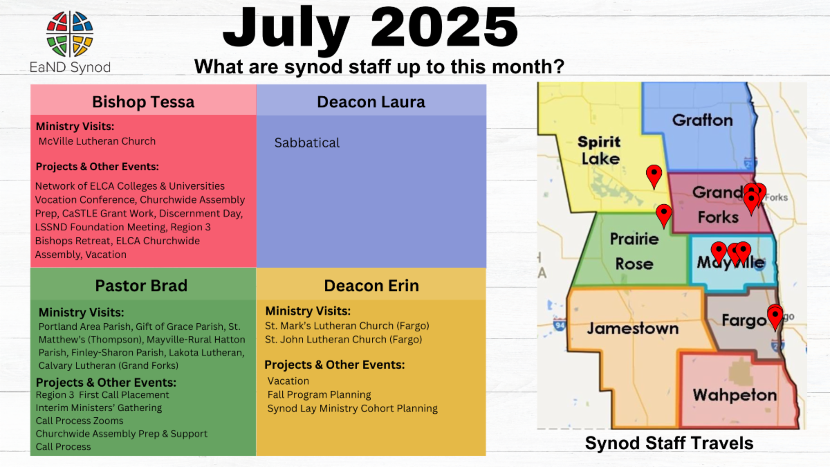 Together we respond to God’s provision by sharing of our financial gifts, both as an act of worship and in support of our mission and ministry as Christ’s Church. Our shared gifts support ministry of our congregations, in our community, across the Eastern North Dakota Synod, throughout the ELCA, and around the globe. Today we recognize: