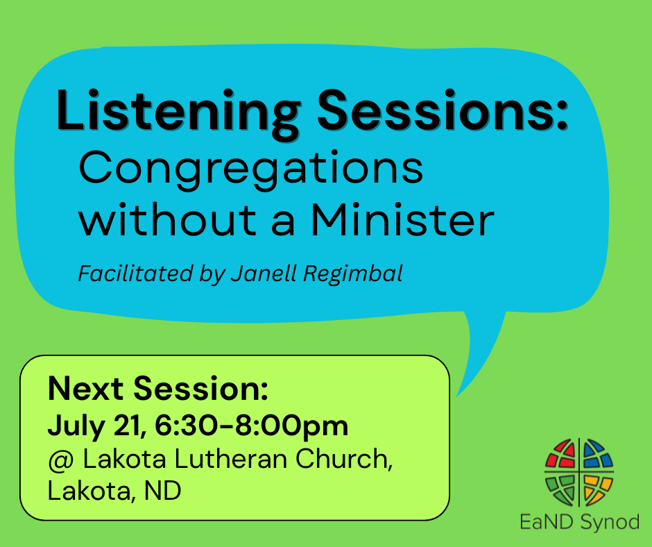 Are you without a regular pastor in your congregation? What are your experiences and challenges in ministry without a regular minister? What are your future aspirations? How does this impact your ministry and what does synod leadership need to know about your experience? Come for a facilitated small group listening session to share your input. There is room for 15 attendees at each session. These sessions are facilitated by Janell Regimbal, formerly of Lutheran Social Services. Download Janell's bio here.