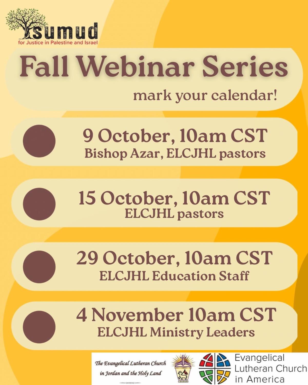 ELCA Sumud is hosting a Fall Webinar Series featuring voices from the Evangelical Lutheran Church in Jordan and the Holy Land.