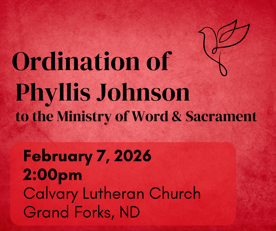 Phyllis Johnson will be ordained to the Ministry of Word & Sacrament on February 7, 2026 at 2pm at Calvary Lutheran Church in Grand Forks, ND. Ministers are invited to vest and process, and the color of the day is red. Join us (and the whole Church) in celebration! Phyllis has been called to Our Savior's Lutheran Church in East Grand Forks.