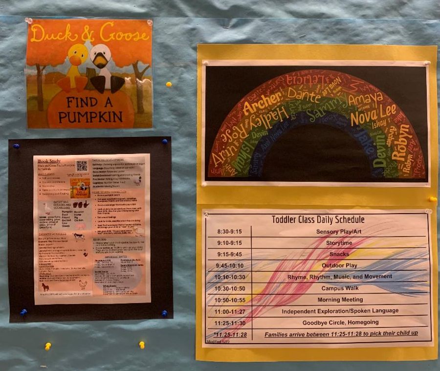 The Toddler Class, Butterflies and Caterpillars, have started their exploration of the book, Duck and Goose Find a Pumpkin. We will look at pumpkins of different shapes colors and sizes. We will even look inside to see how pumpkins look, feel, and smell. And, be on the lookout for our Pumpkin Patch mural.
