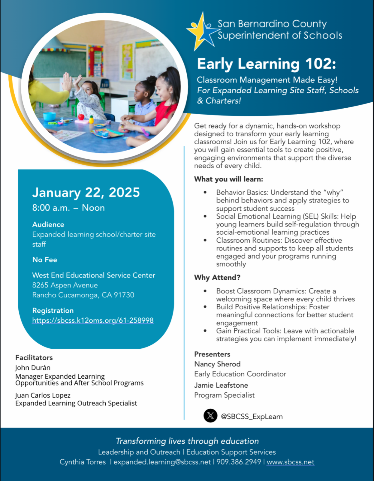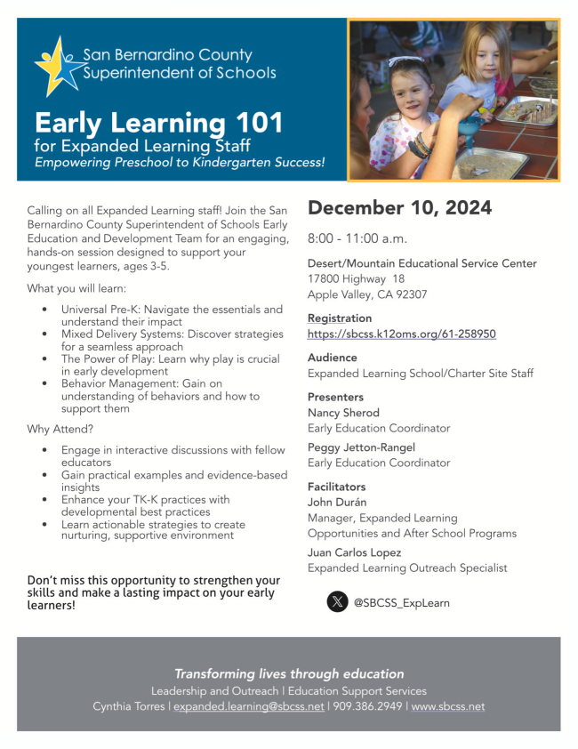 For more information call 909-386-2949 or email expanded.learning@sbcss.net