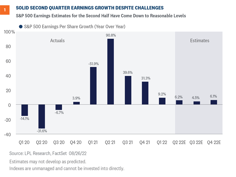 Earnings growth of 6-7% doesn’t sound very exciting, but given the challenges corporate America has faced, we consider the nearly-complete second quarter earnings season a resounding success. The numerous challenges last quarter included a slowing economy, intensifying inflation pressures, ongoing global supply chain disruptions, and a surging U.S. dollar. Still, corporate America delivered the type of upside investors have grown accustomed to in much easier economic environments.