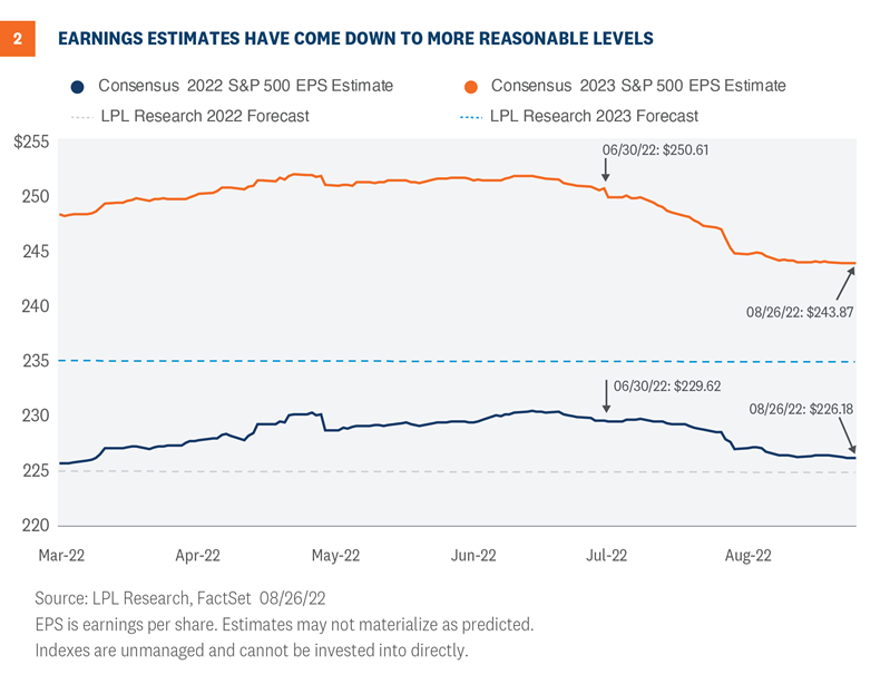 Coming into earnings season, the overwhelming view from Wall Street strategists was that earnings estimates had to come down substantially. The thought process for many was that earnings drop in a recession, so while 2022 profits may be near consensus estimates (our expectation), 2023 may see a profit decline. That would make our $235 estimate for S&P 500 EPS in 2023 overly optimistic and potentially put something like $200 in play (not our expectation).