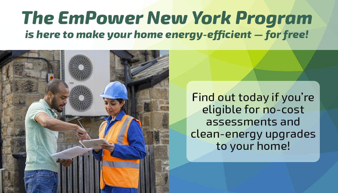 NYSERDA’s EmPower New York program provides no-cost energy efficiency solutions to income-eligible New Yorkers. Homeowners and renters will be connected with a participating contractor to assess if a home would benefit from free energy upgrades such as: