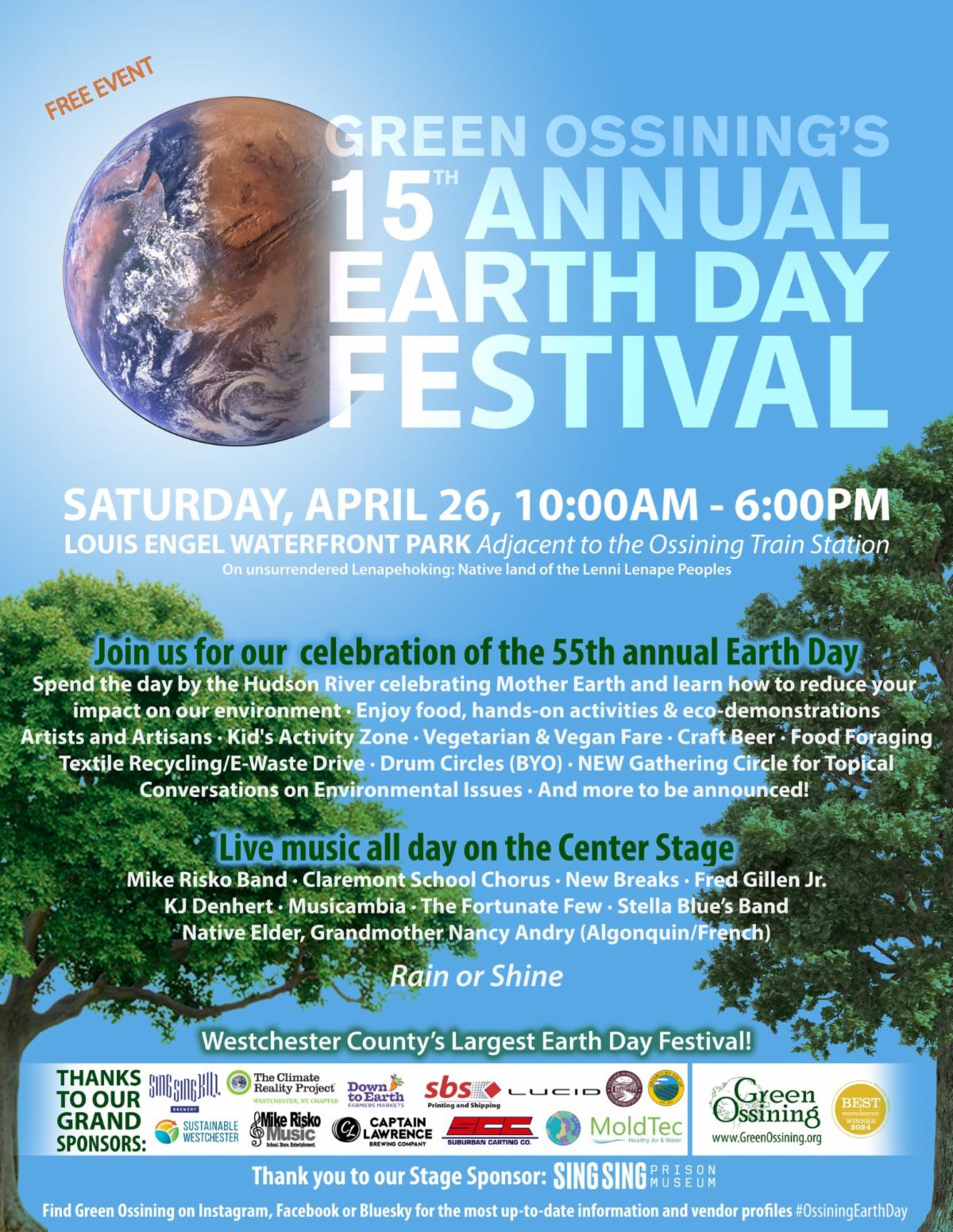 Green Ossining Earth Day Festival, 10 AM - 6 PM at Louis Engel Waterfront Park, Ossining (25 Westerly Rd., Ossining, NY 10562). Westchester’s largest Earth Day festival is back for another year! My office will be co-hosting a booth with Senator Harckham’s team; stop by!