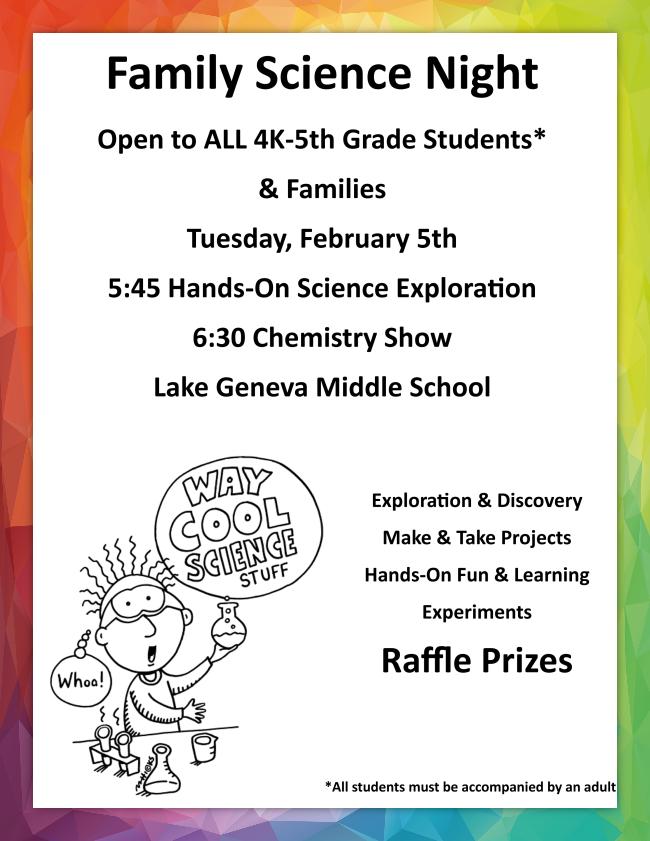 - Family Science Night, 5:30 at LGMS