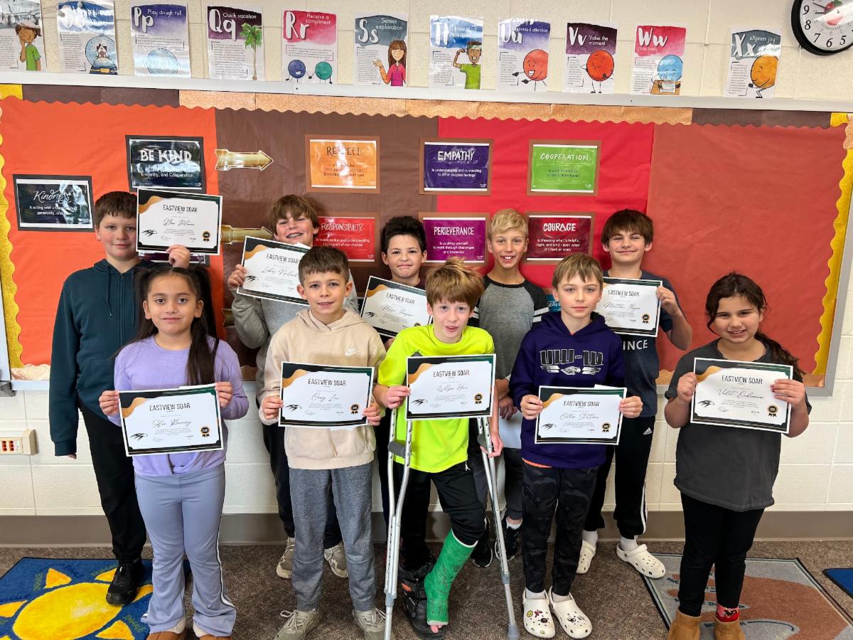 SOAR Award recipients are not necessarily those students who excel academically or in extracurricular activities. With this award, staff are striving to recognize students who continue to follow school-wide and classroom expectations, and who exhibit values that make a positive difference in our school and community. These are students who demonstrate exceptional character but never expect recognition. They are members of our Eastview Elementary community who are seen as positively impacting the culture of our school on a daily basis.