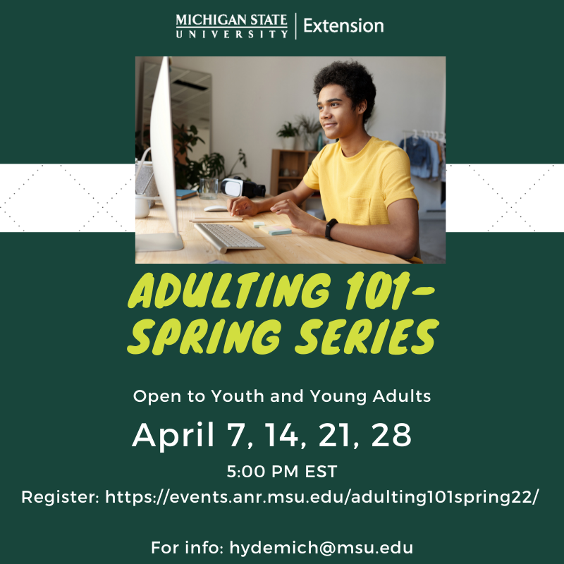 Ready to be out on your own? Learn some important skills to be successful as an adult. Our Adulting 101-Spring Series includes: Paying for Post-Secondary, Communication, Credit, and Resume. Bring questions and gain practical skills you can use in your everyday life. Webinars will be held on April 7, 14, 21, and 28 from 5:00-6:00 PM. EST. Register at: https://events.anr.msu.edu/adulting101spring22/
