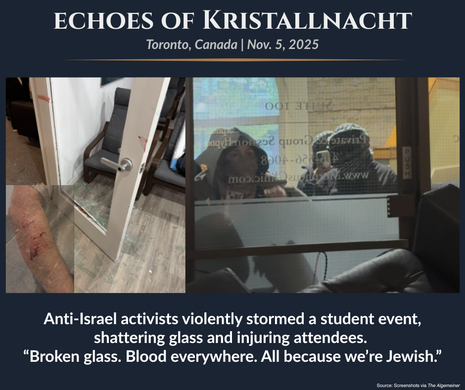 Students for Justice in Palestine activists at the Toronto Metropolitan Univ. violently stormed an event featuring an Israeli speaker. Students Supporting Israel campus chapters routinely host Israeli veterans to discuss their experiences fighting Hamas terrorists. Activists used a drill bit to shatter a glass door, causing cuts and abrasions on multiple victims. SSI released a statement: “Broken glass. Blood everywhere. All because we’re Jewish – and tried to open dialogue.”