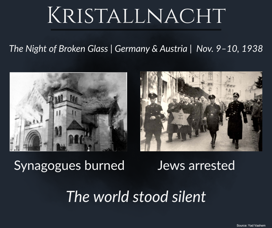 In a single night, Nazi forces, Hitler Youth and civilian mobs burned 1,400 synagogues, destroyed 7,000 Jewish-owned businesses and arrested 30,000 Jewish men who were sent to concentration camps. German authorities stood by as mobs looted businesses, torched synagogues and murdered nearly 100 Jews. The “Night of Broken Glass” shattered not only windows – the coordinated attacks began to shatter Jewish life across Europe.