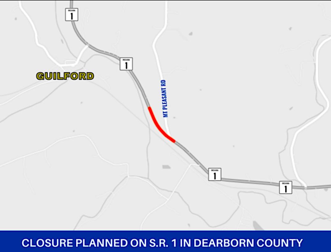 Indiana Department of Transportation (INDOT) is scheduled to close State Road 1 at Mt. Pleasant Road on or after Monday, April 15, to complete a slide correction near Guilford, Indiana.