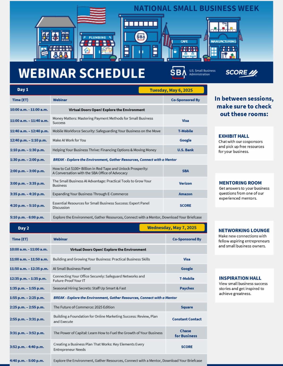 The National Small Business Week Virtual Summit will take place May 6-7 2025. This is a free two-day online event featuring expert-led webinars, networking opportunities, free business tools and more, to help small business thrive.