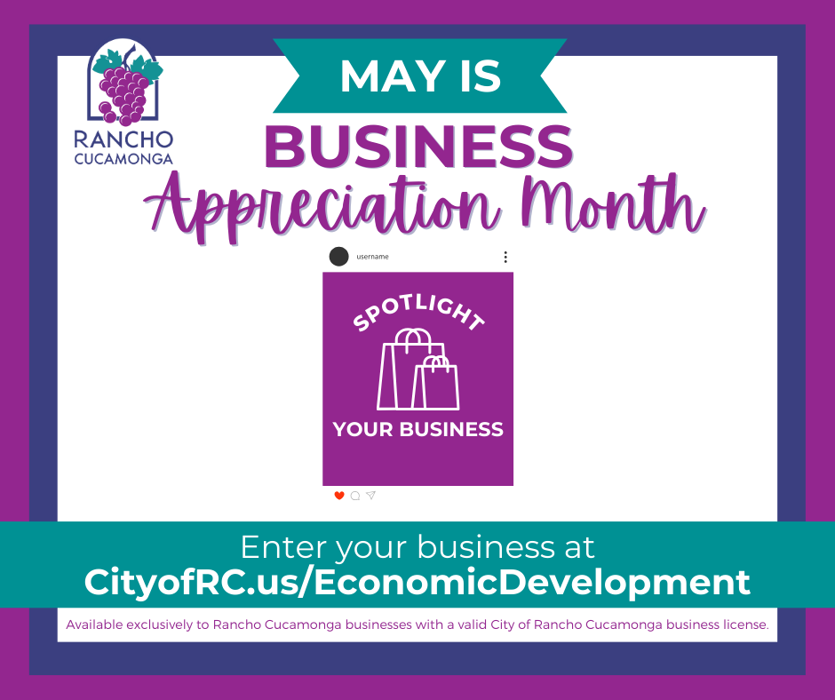 | | To celebrate Business Appreciation Month, the City is spotlighting its incredible local businesses on the City of Rancho Cucamonga's Economic Development Facebook page. Business owners with a valid City of Rancho Cucamonga business license are invited to fill out the form to be featured! | | Other Programs and Events | | |